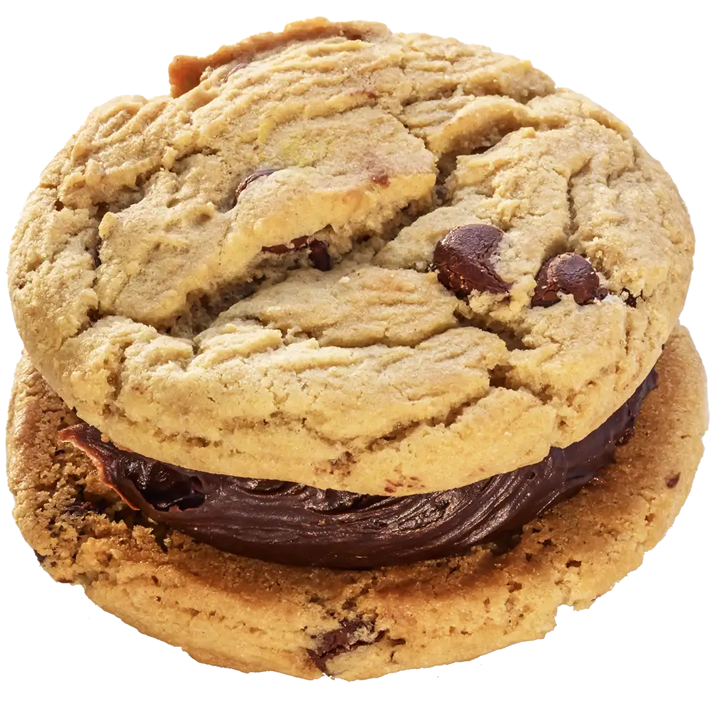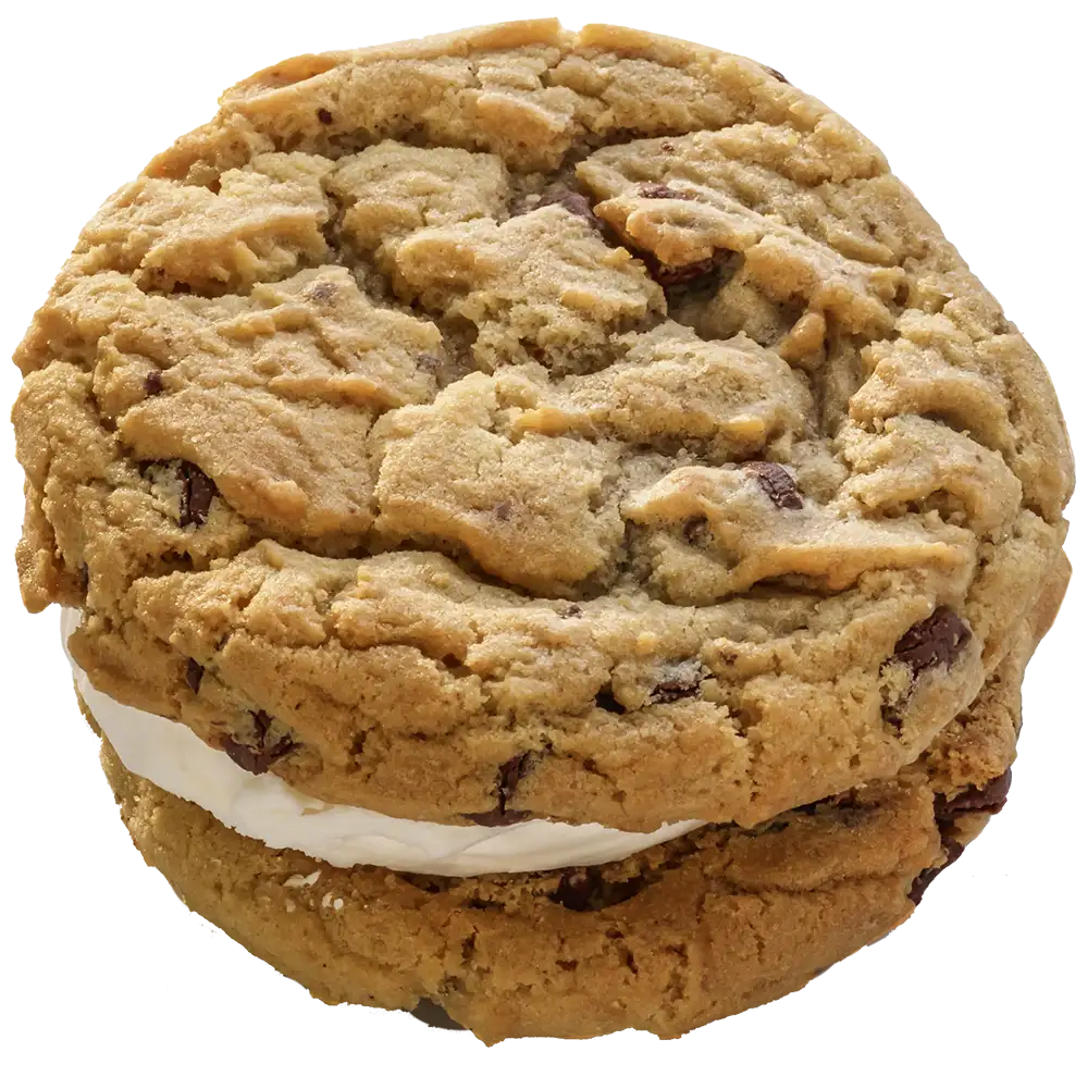 2 2-oz delicious chocolate chip cookies with a huge scoop of vanilla or chocolate buttercream frosting in the middle.